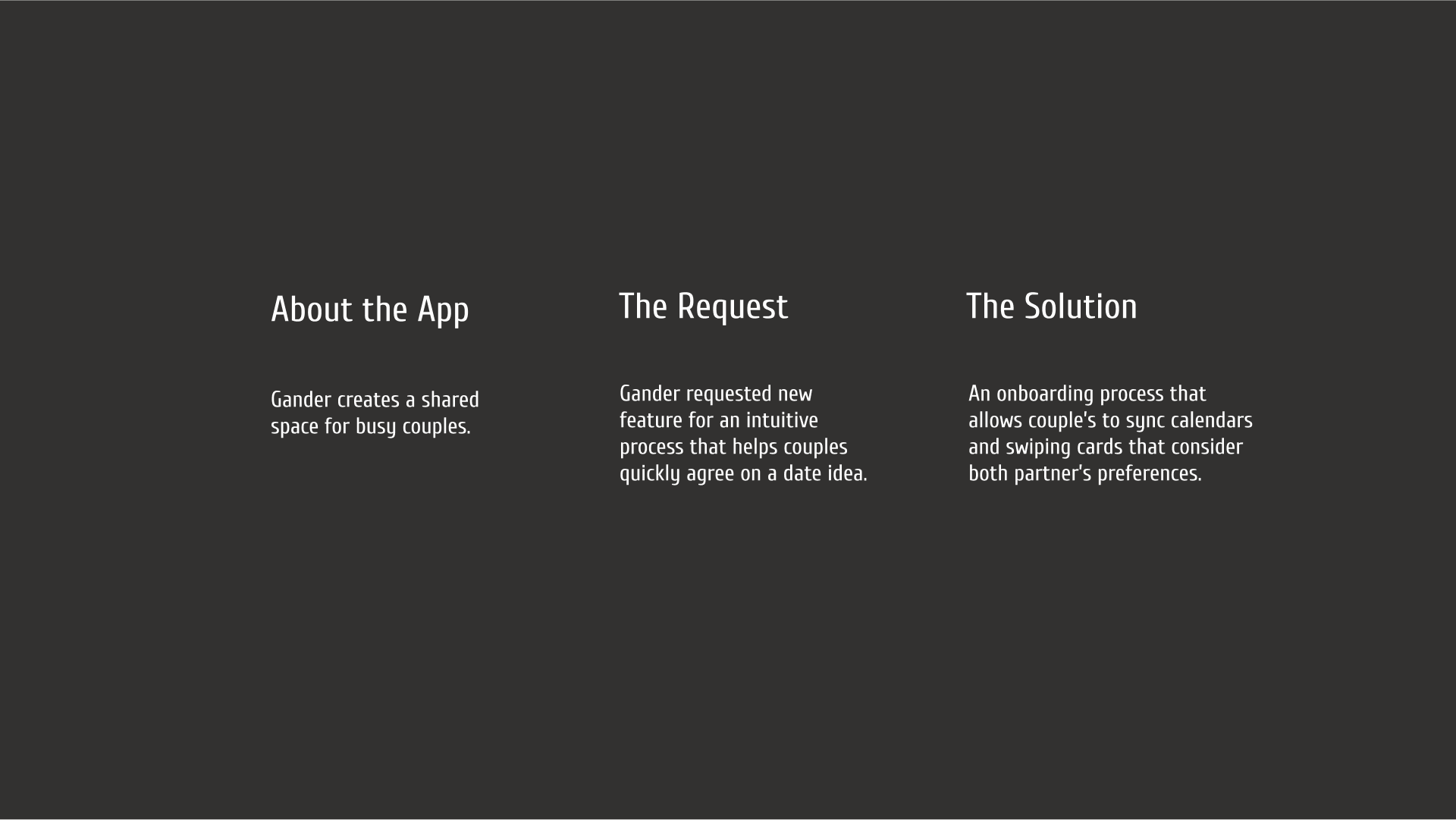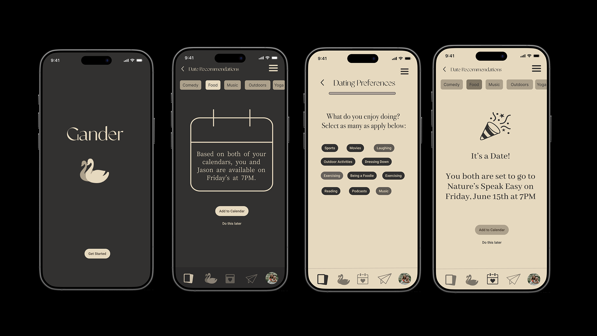 For the couples who just can’t decide, Gander is a mobile app that finds the middle ground to recommend elevated dating experiences both partners can enjoy. With clever onboarding choices like syncing schedules and a fair voting system, Gander creates an easy “yes, I’ll be ready at 7pm”.